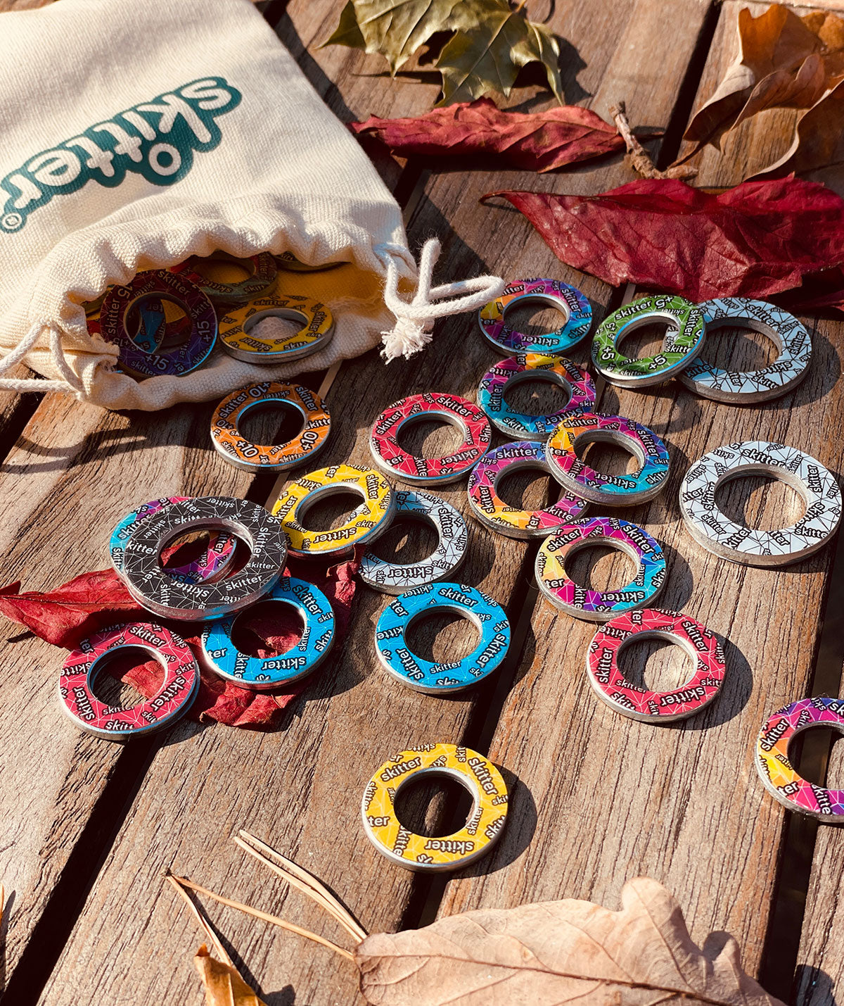 - 45 Skitts: farbenfrohe Metallscheiben zum Schnippen